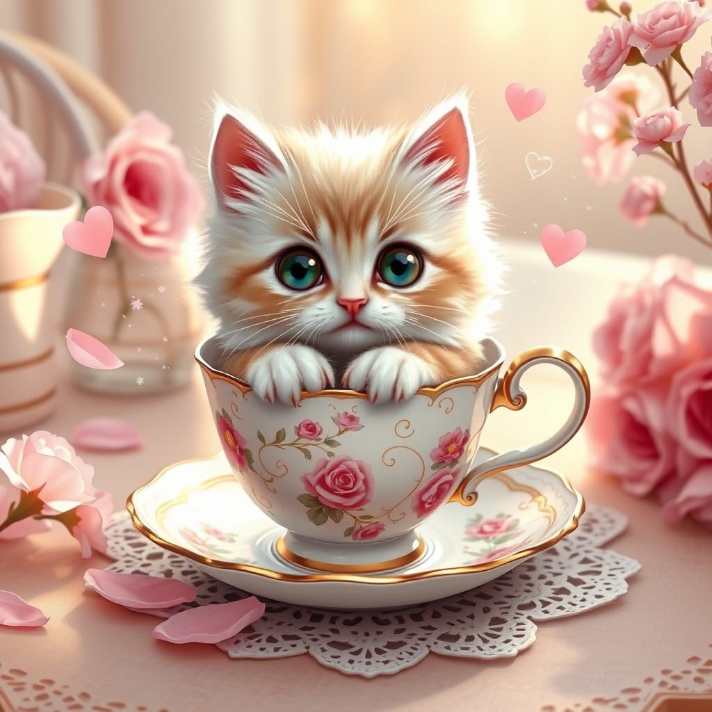This image shows a cute, pastel-hued kitten in a delicate floral teacup, surrounded by rose patterns, gold accents, and soft petals, set against a warm, inviting café table scene, exuding tranquility and whimsy, in a digital painting style
