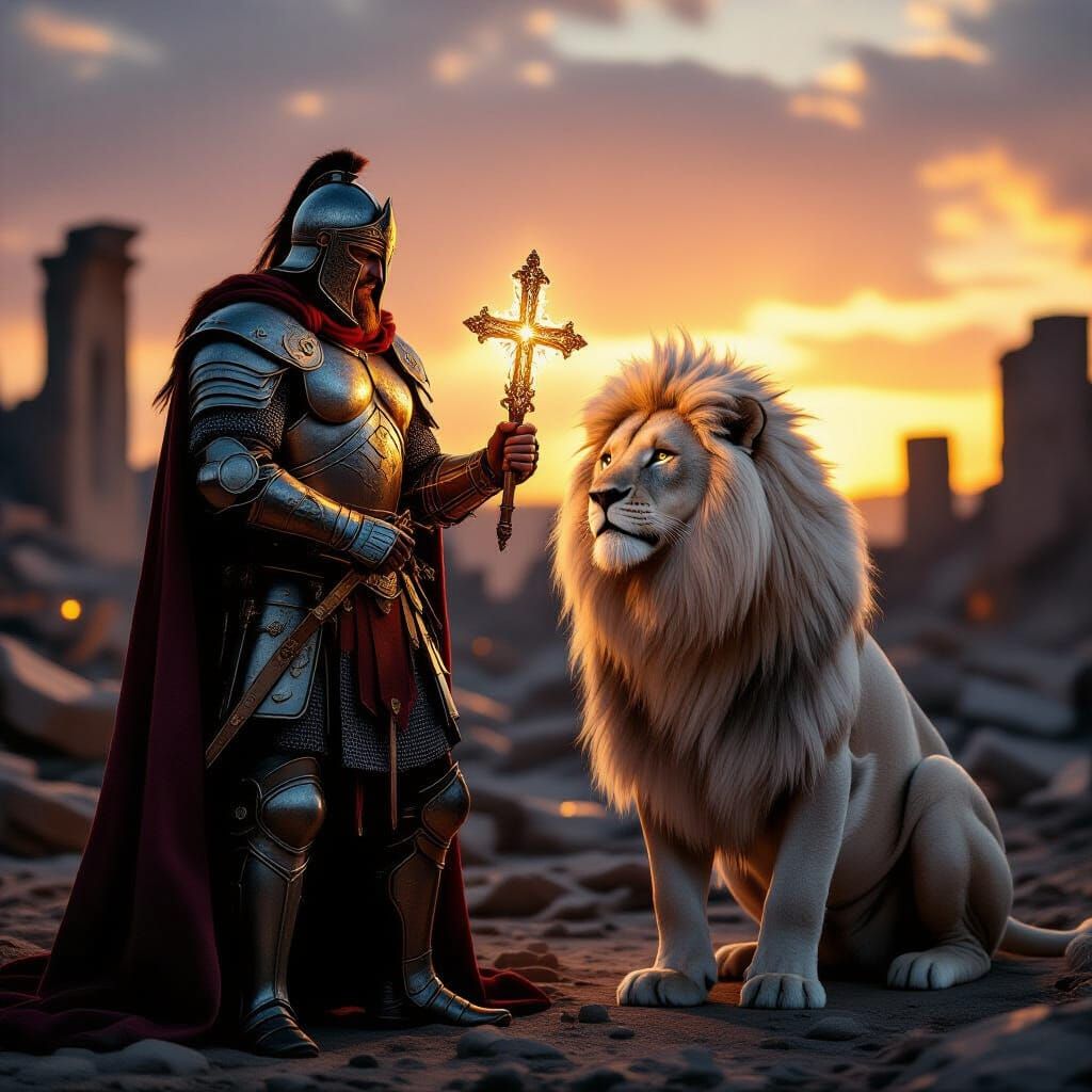 This image depicts an ancient warrior in steel armor holding a glowing cross, standing with a white lion in battlefield ruins. The scene features dramatic sunset lighting and a cinematic, wide-angle perspective.