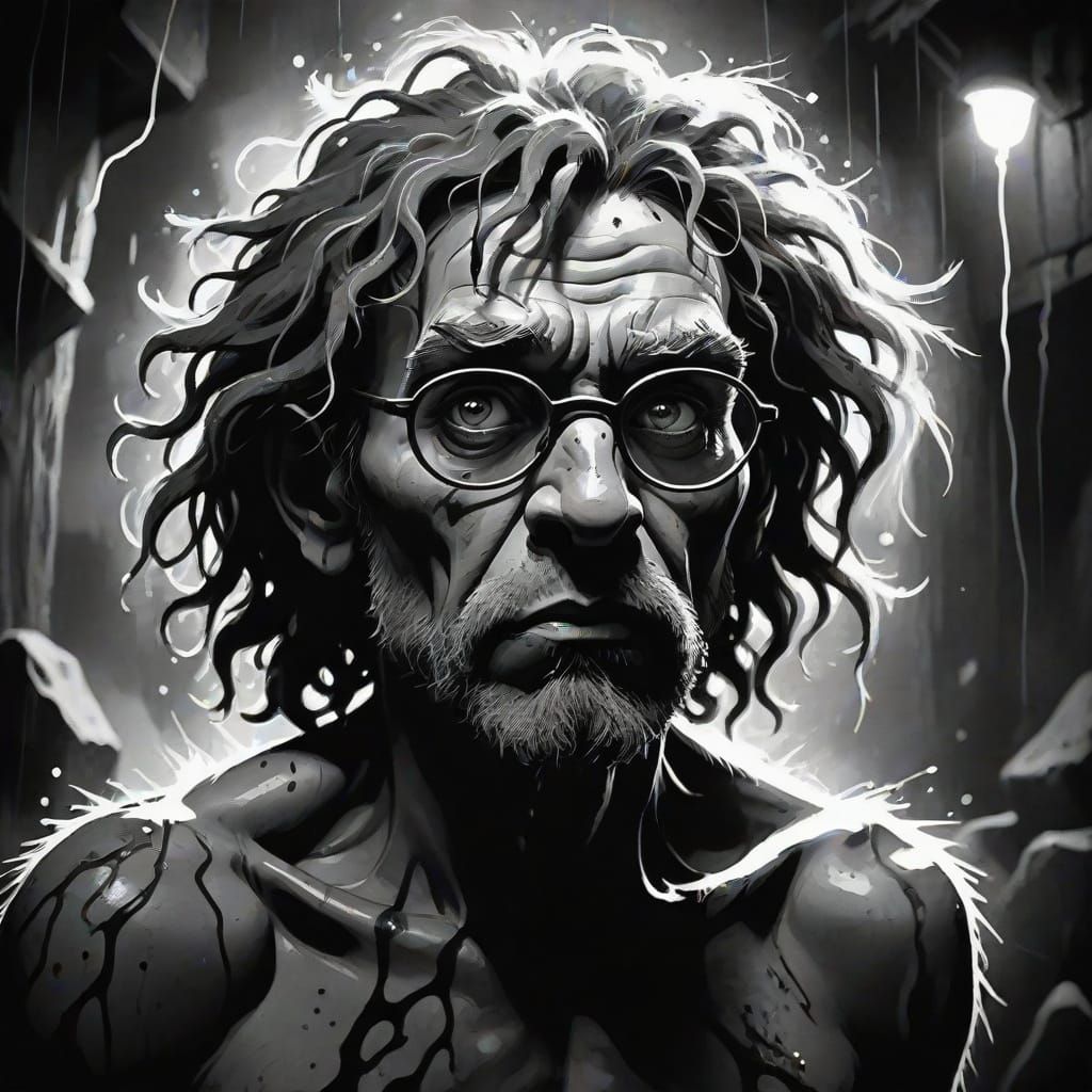 This image shows a film noir style sketch of a slender woman with curly blue hair and futuristic glasses. The high-contrast image features expressive ink splatters, dramatic lightning, and moody shadows.