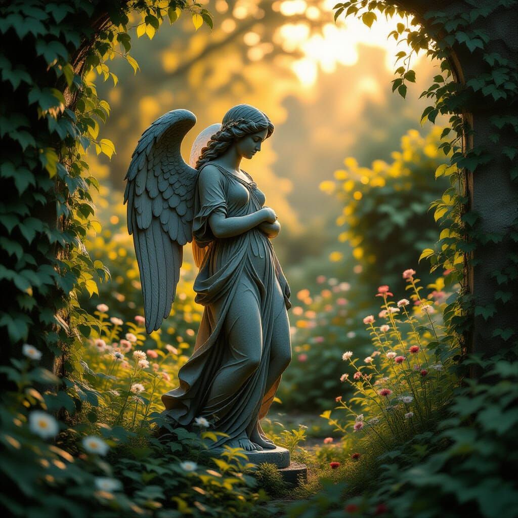A solitary, weathered angel statue stands in a forgotten garden, overgrown with ivy and wildflowers. The statue's features are softenened.