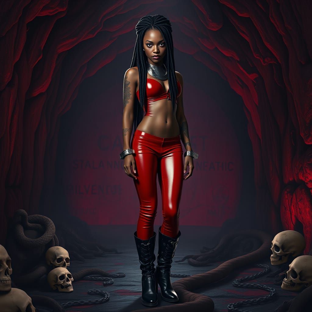 A striking image of a confident gothic teenage girl in a red latex outfit, set against a dark and eerie crypt cave backdrop with chains, skulls, and macabre details.