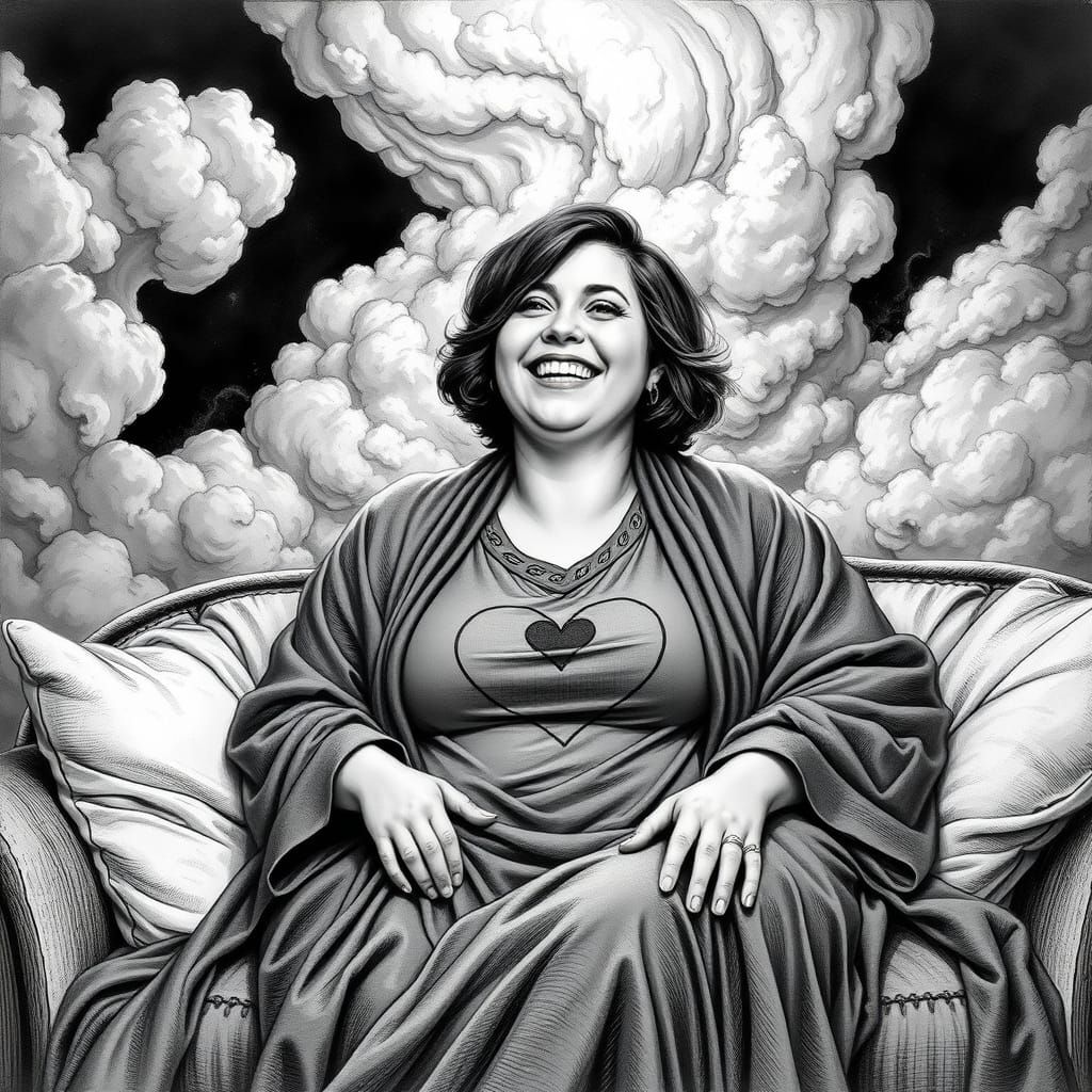 This image shows a plus-size woman sitting on a couch, surrounded by swirling clouds in a dramatic monochrome style with bold textures and deep contrasts, reminiscent of grand mythical scenes.