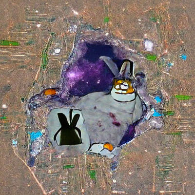 This image depicts a surreal scene of a large, cartoonish rabbit figure amidst a dark, seemingly endless space filled with decaying remains, creating a morbid yet comical juxtaposition.