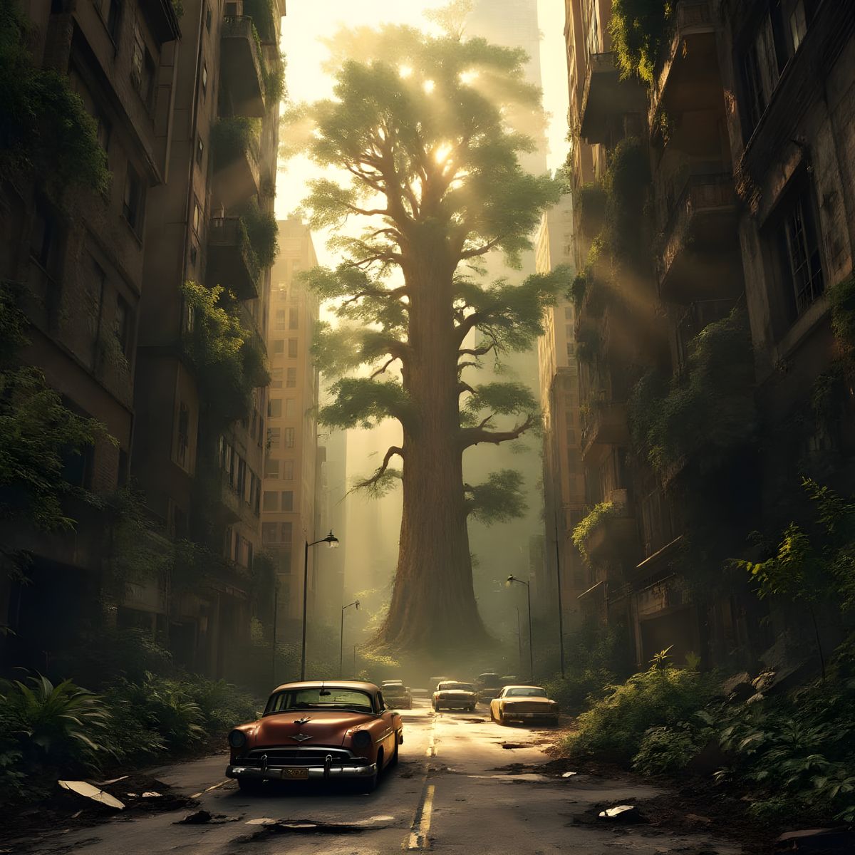 This photorealistic image captures an abandoned Art Deco city street. Lush vegetation covers towering skyscrapers, with a redwood tree breaking through a rotunda. Sunbeams highlight details in this atmospheric, hyper-detailed scene.