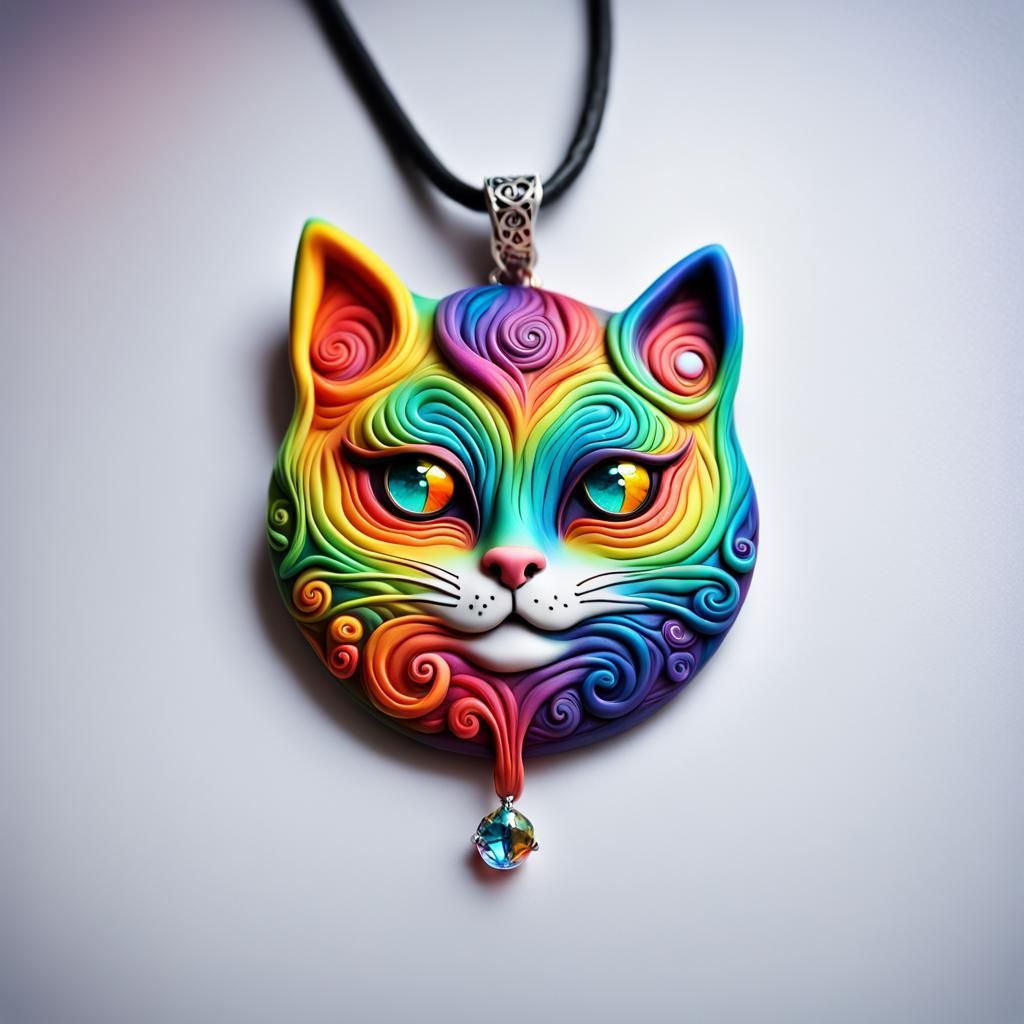 A vibrant polymer clay pendant featuring a cat face with swirling rainbow colors and crystal eyes. This unique piece showcases graffiti art elements with a splash art aesthetic.