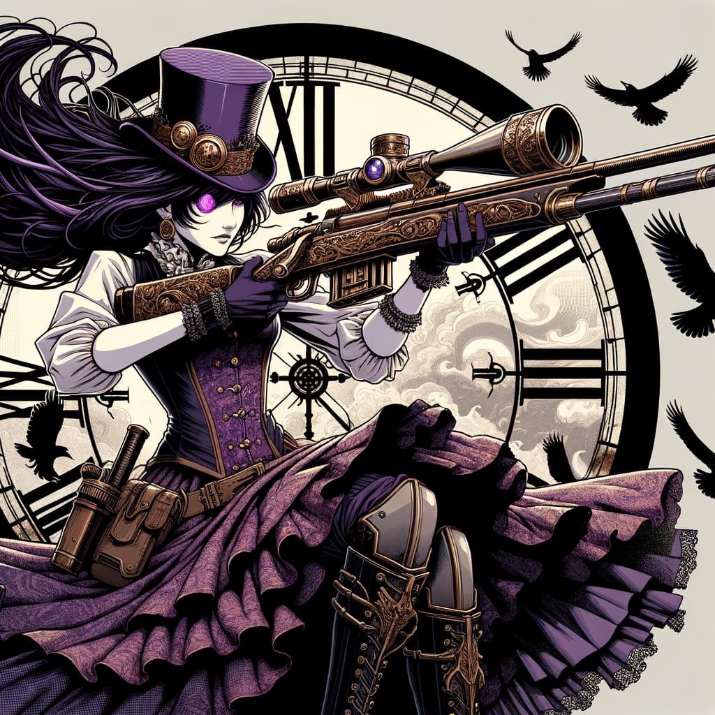 This image shows a steampunk sheriff with purple hair and a monocle, aiming a sniper rifle from a gothic clock tower. Rendered in bold manga style with cel shading and vintage texture.