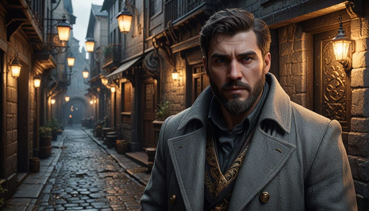 This detailed matte painting depicts a man in a grey coat in a shadowy alley. Golden tavern light illuminates his face, set against vibrant signage and deep colors.