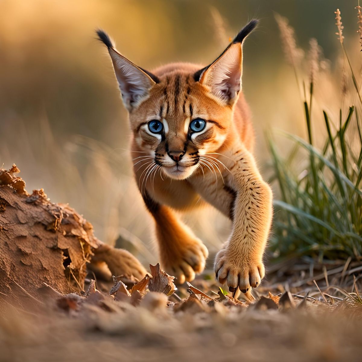 This image shows an adorable Caracal kitten learning to hunt. The close-up portrait captures the kitten stalking a toad, rendered with soft lighting and a sharp focus.