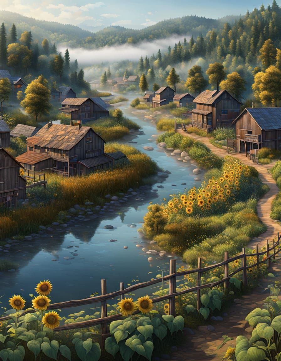 This image shows a detailed, photorealistic panoramic view of a village on an early September morning. Features include wooden houses, sunflowers, fences, a dense forest, riverbed, and light fog in the valley under a clear sky.