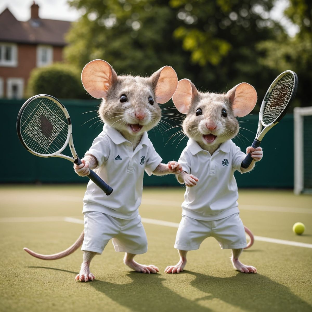 cartoon mice dressed in tennis whites playing tennis in the Wimbleton Wombleton
