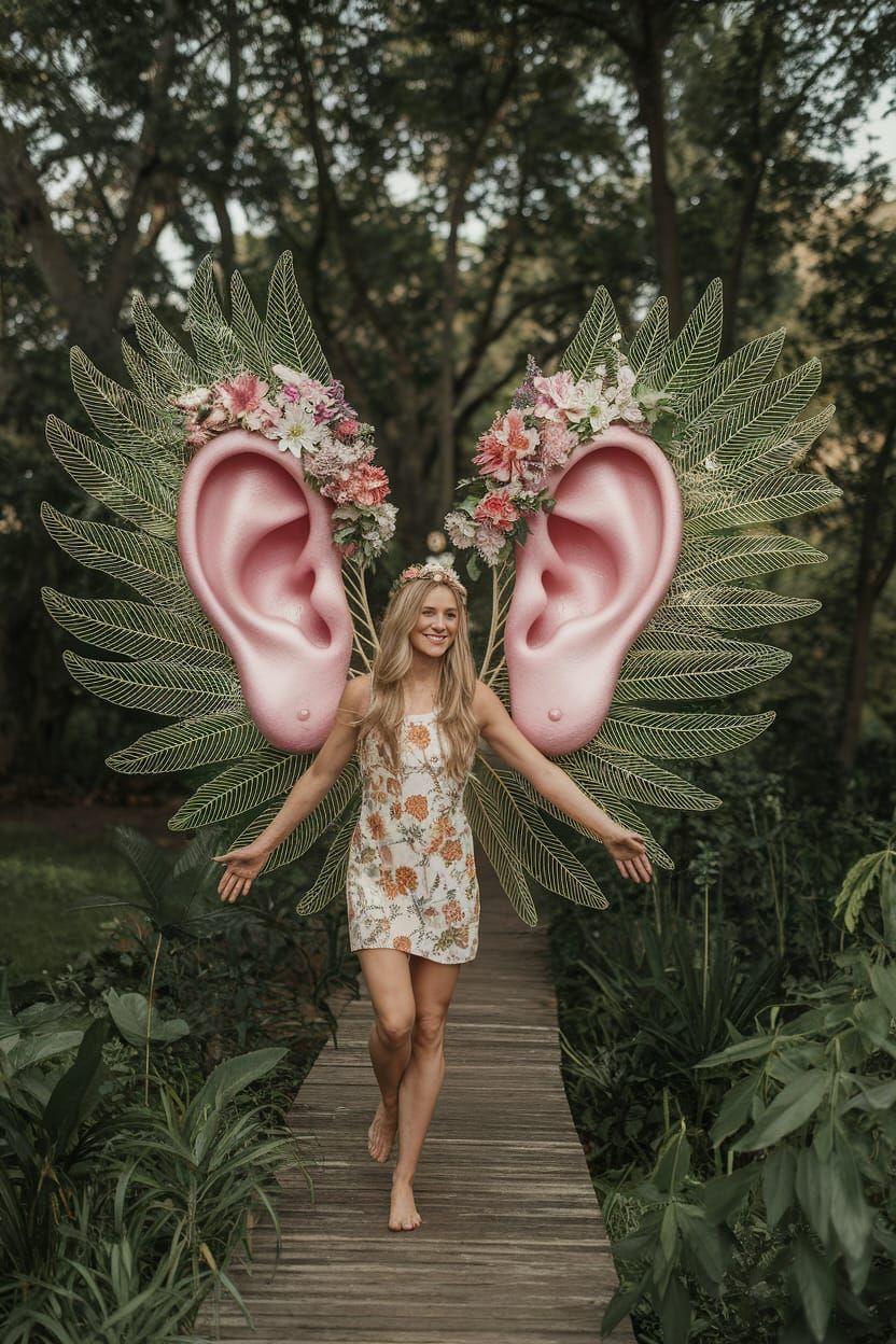a welcoming party of anthropomorphic ears giant human ears with faces arms legs floral gossamer filigree wings and massive personalities emerges from the glossforest performing a floaty willowy routine of greeting but also to mesmerise us just a little bit