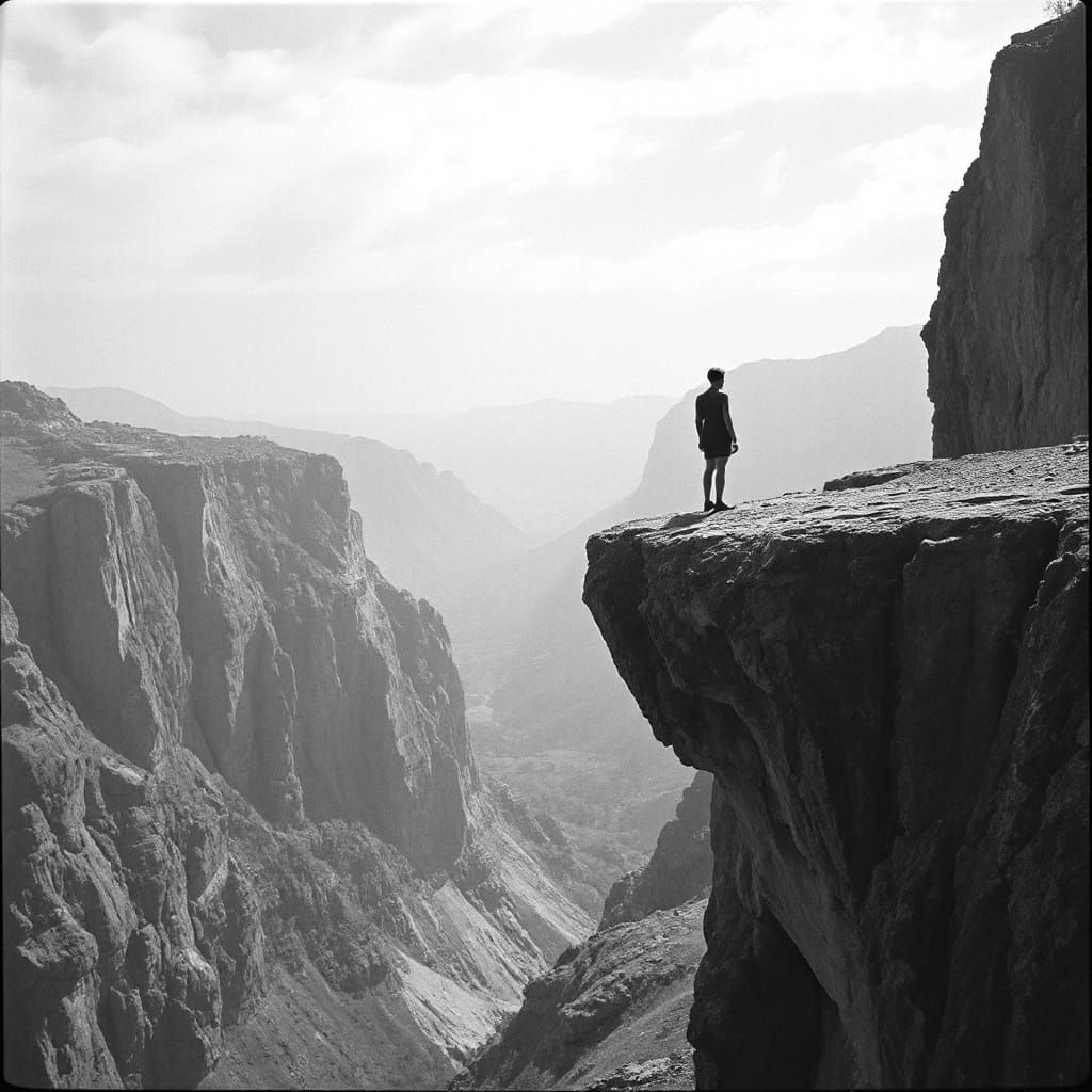 This image shows a dramatic cliffside scene reminiscent of the film 'Vertigo'. The composition and high contrast lighting evokes classic black and white photography.
