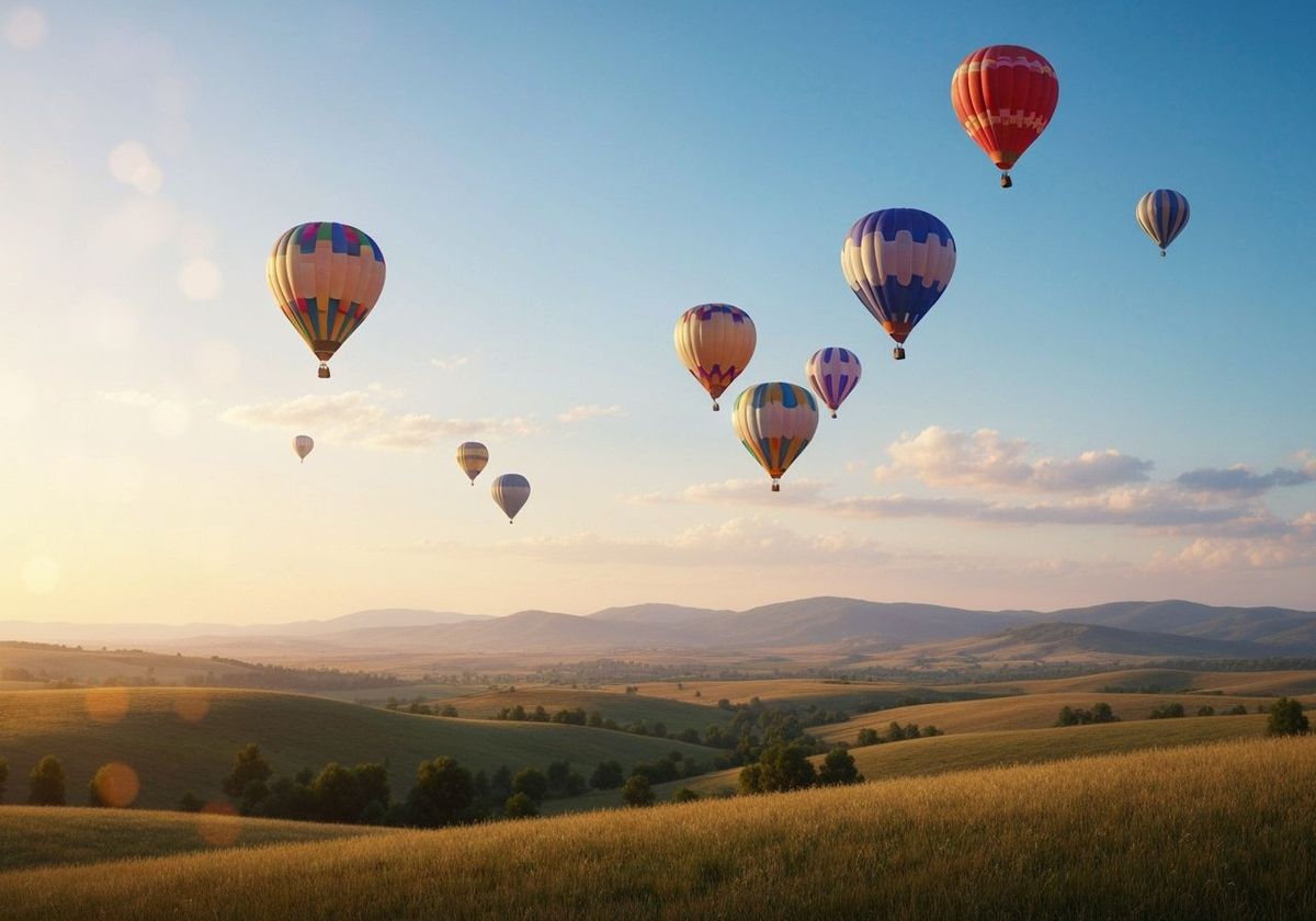This image depicts a hyperrealistic summer sky with colorful hot air balloons floating above rolling hills. Features cinematic lighting and high detail, evoking a sense of wonder.