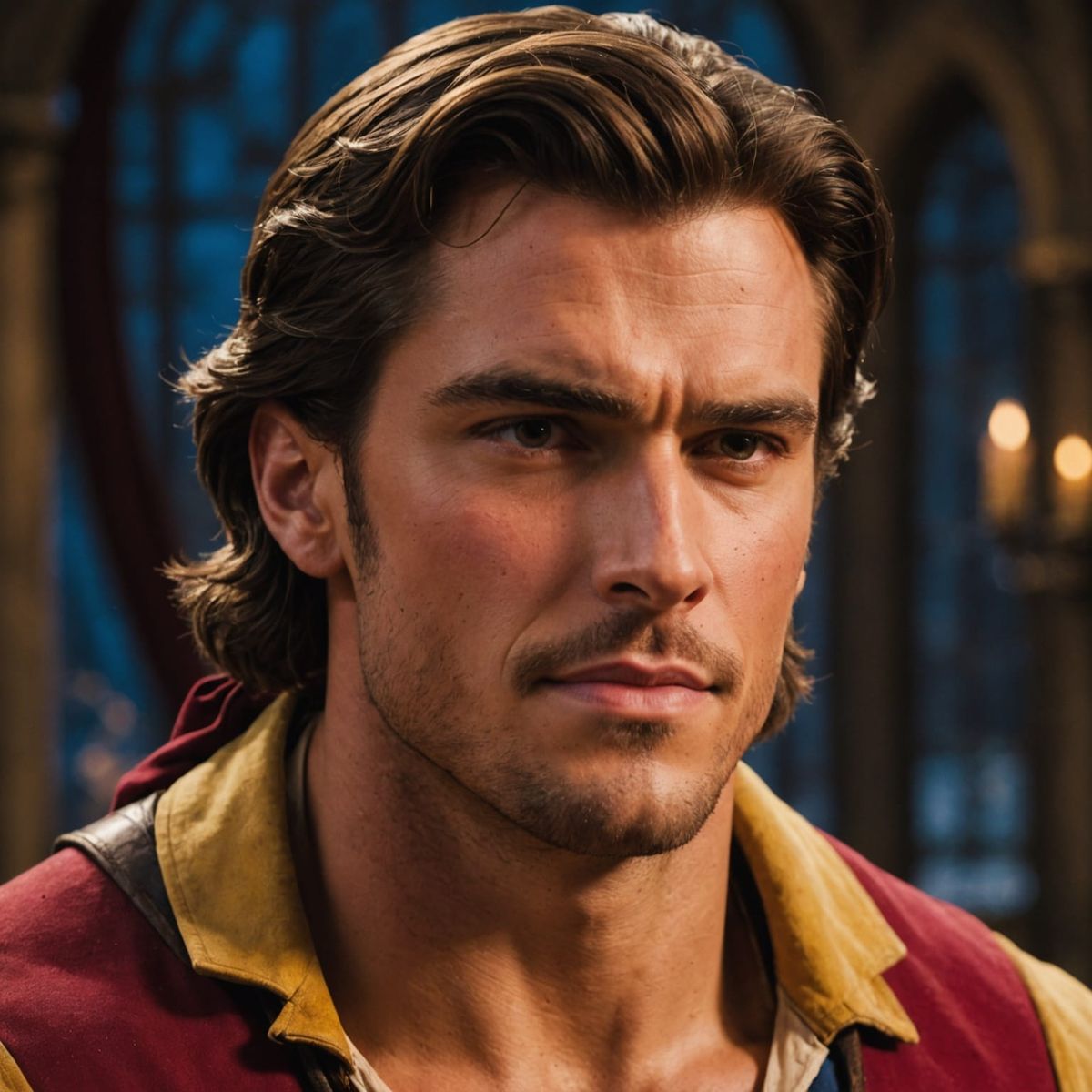 This image features a detailed close-up of Gaston's face and neck, highlighting his famously chiseled and handsome features from Beauty and the Beast.