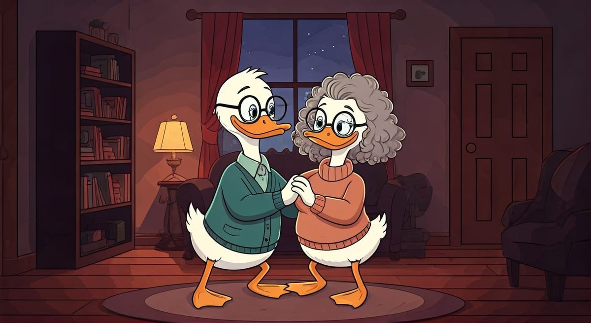 This image shows a cartoon of an elderly male drake in glasses and a cardigan slow dancing with an elderly female duck with gray curls and glasses in their living room.