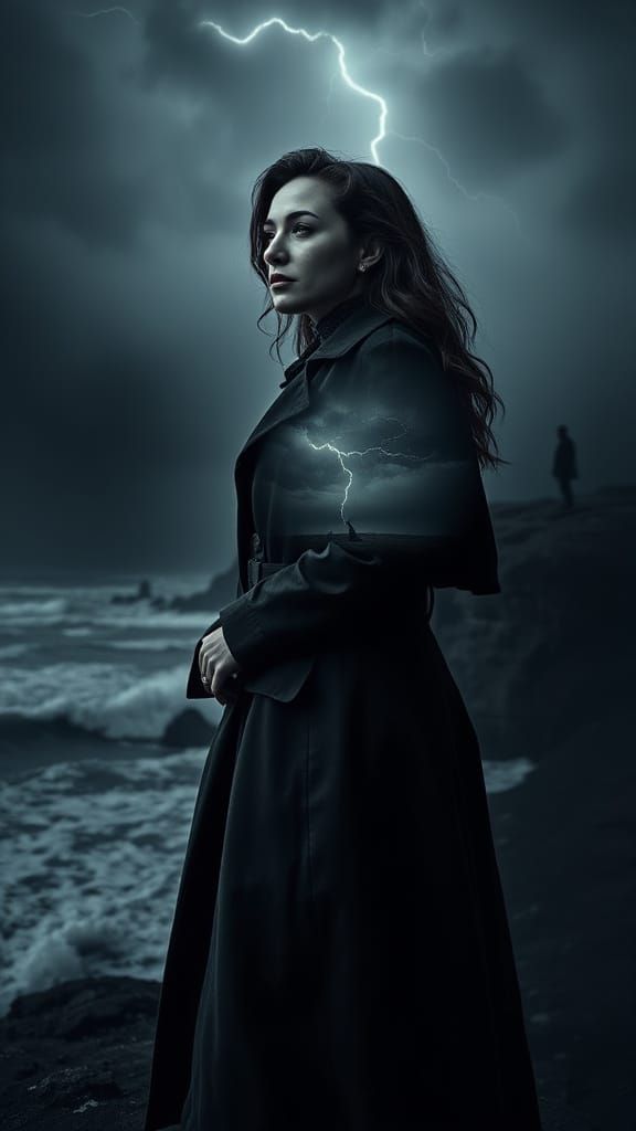 This image shows a double exposure portrait of a woman gazing into the distance. Her silhouette reveals a dramatic coastal scene with crashing waves and stormy skies, rendered with sharp contrast and atmospheric depth.