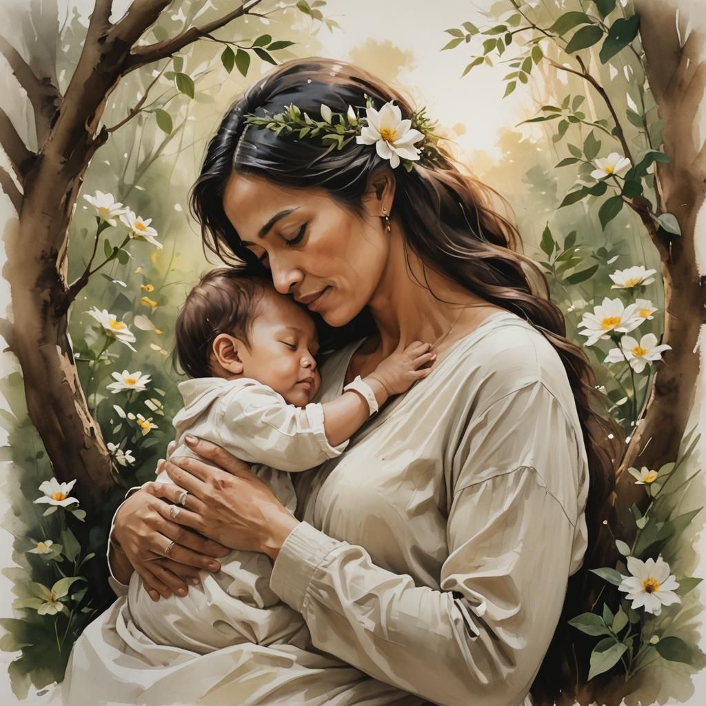 This image shows a mother and child in a loving embrace. It captures their unique bond with emotive details and exquisite composition, depicted as detailed matte painting in complementary colors.