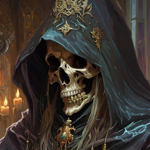 A striking picture of a lich wizard in black robes with an ornate skull. This hyperrealistic digital illustration features detailed cloth and subtractive lighting in a dark fantasy style.