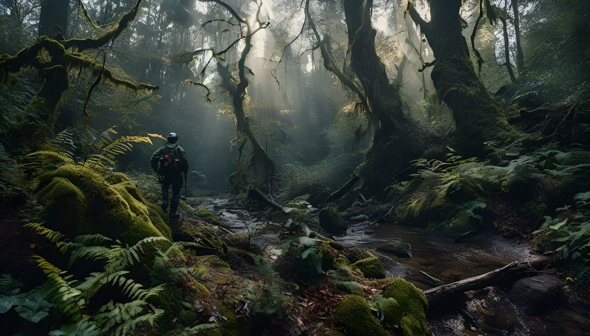 A striking picture of a face with a strong expression, created with double exposure and transparency effects. The image blends elements of a burning forest, galaxies, and plant life in a painterly style.