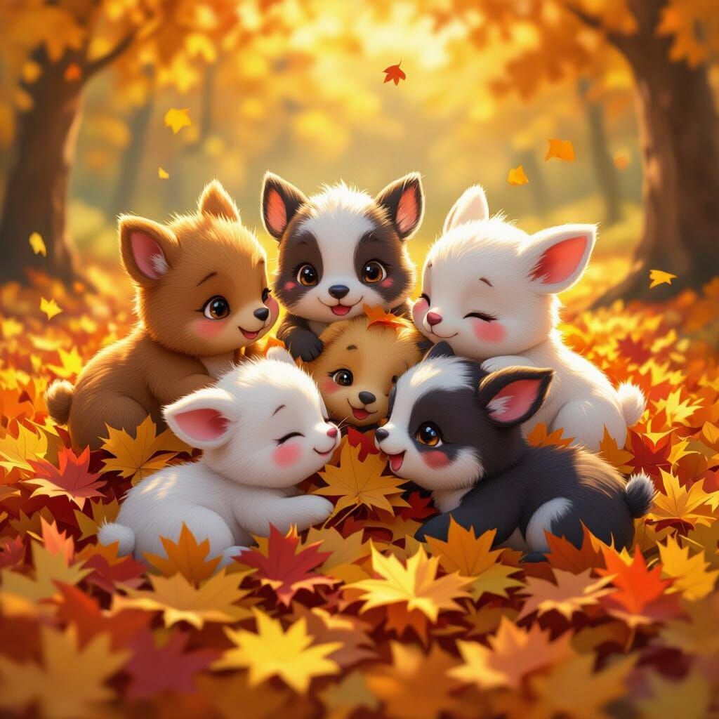 This image shows adorable baby animals joyfully playing in a pile of colorful autumn leaves, bathed in warm sunlight. It features a kawaii anime illustration with vibrant colors and intricate detail, resembling concept art.