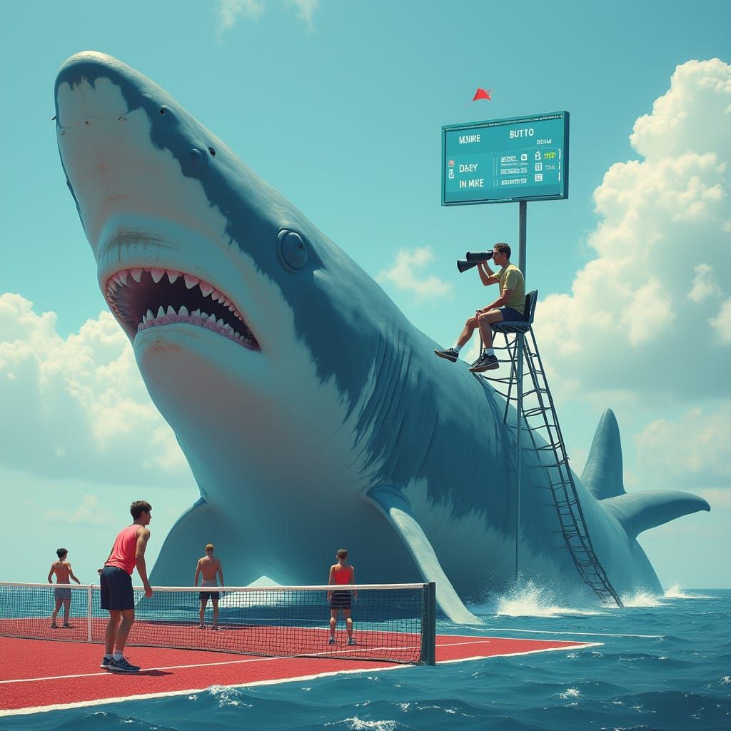 A whimsical image shows a tennis court on the back of a blue whale shark. Players compete as a referee watches from a high chair, all rendered in vibrant detail.