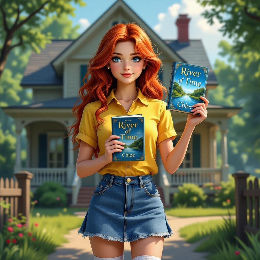 This image showcases a 14-year-old girl with red hair and blue eyes, wearing a yellow shirt and jean skirt. The detailed matte painting features a fantastical, intricate design with deep, complementary colors, evoking a sense of wonder.