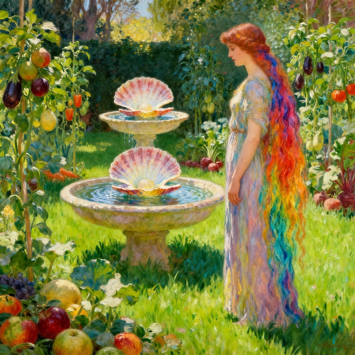 This image shows a beautiful woman in a lush garden with abundant fruits and vegetables. A unique two-layer clam shell fountain graces the center, all rendered in a detailed oil painting style with glowing light.
