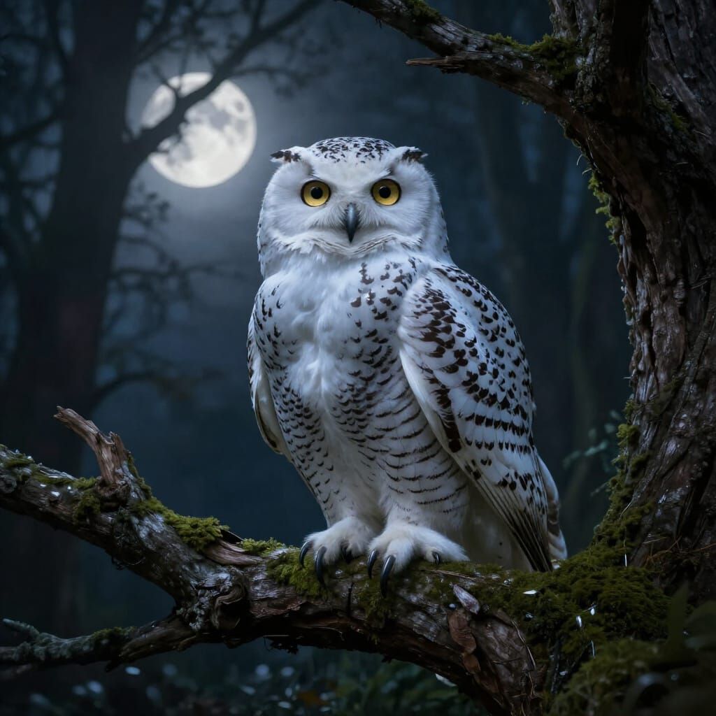 This hyperrealistic fantasy art shows a lone snowy owl with golden eyes perched on a mossy oak branch. Ethereal moonlight illuminates intricate feather details and casts mystical shadows.