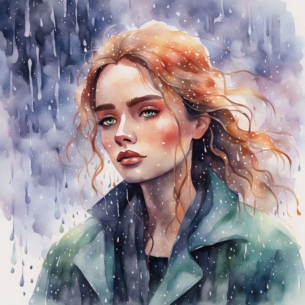 This image depicts a pretty girl slipping in the rain, rendered with whimsical brushstrokes and soft pastel colors. The watercolor painting features warm golden lighting and a dreamy atmosphere.