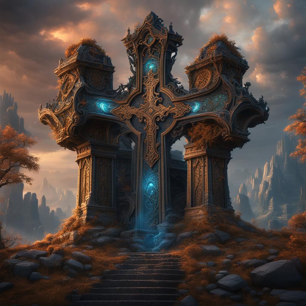 A detailed matte painting of a cross. The image features deep colors, intricate details, complementary colors, and a fantastical aesthetic.