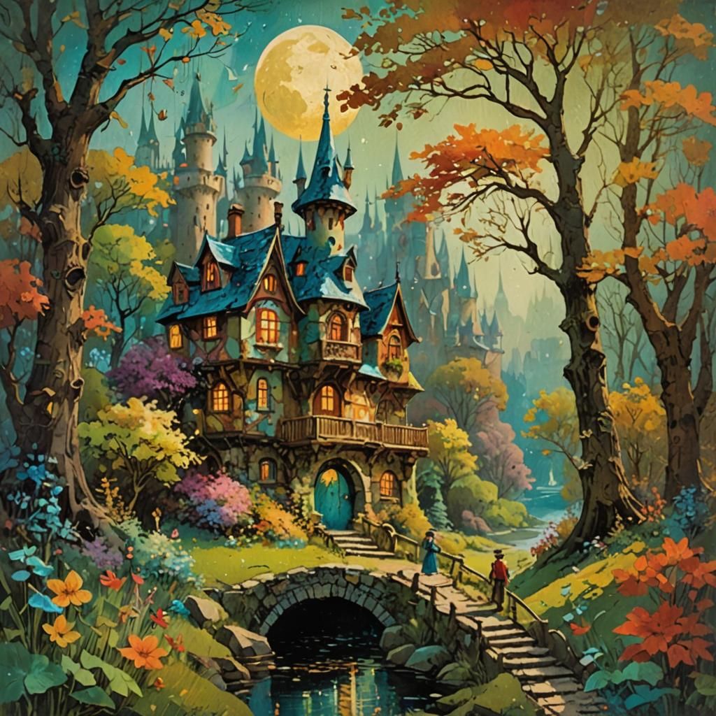 A vintage postcard of a whimsical fairytale scene. The image features rich, saturated colors and masterful light effects, resembling dimensional modern impressionism with layered, textured brushwork.
