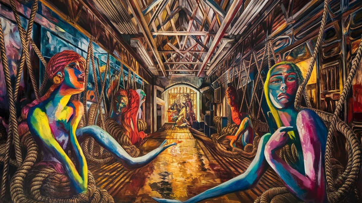This masterful oil painting depicts a surreal scene inside a seedy warehouse, featuring abstract women formed from intricate rope patterns illuminated by golden hour light.