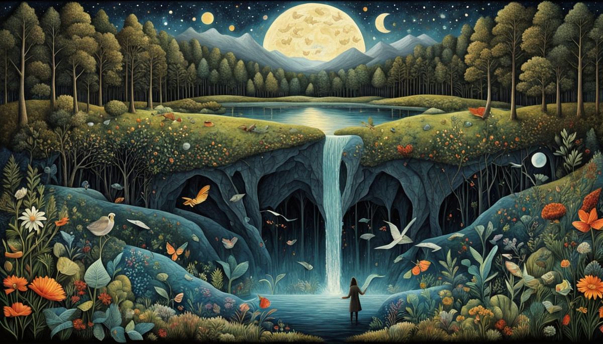 This vibrant digital artwork is a mesmerizing collage of glowing elements, blending nature, spirit, and cosmic realms. Featuring a central figure of strength and resilience, the piece urges viewers to follow their dreams and seek authenticity in a world of noise.