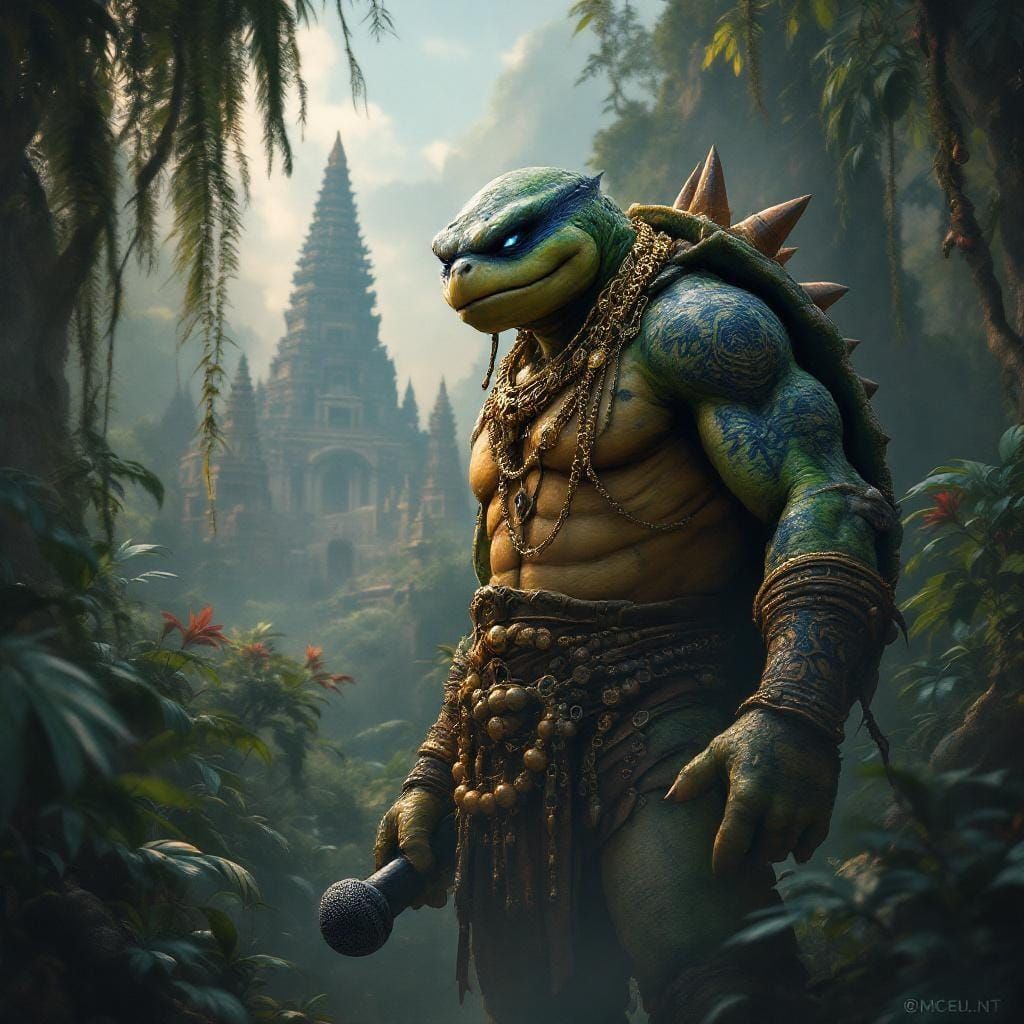 This image shows a muscular, green turtle humanoid bard with blue eyes and tribal tattoos in a rainforest setting. He is depicted wearing gold chains and holding a microphone, created as fantasy concept art.
