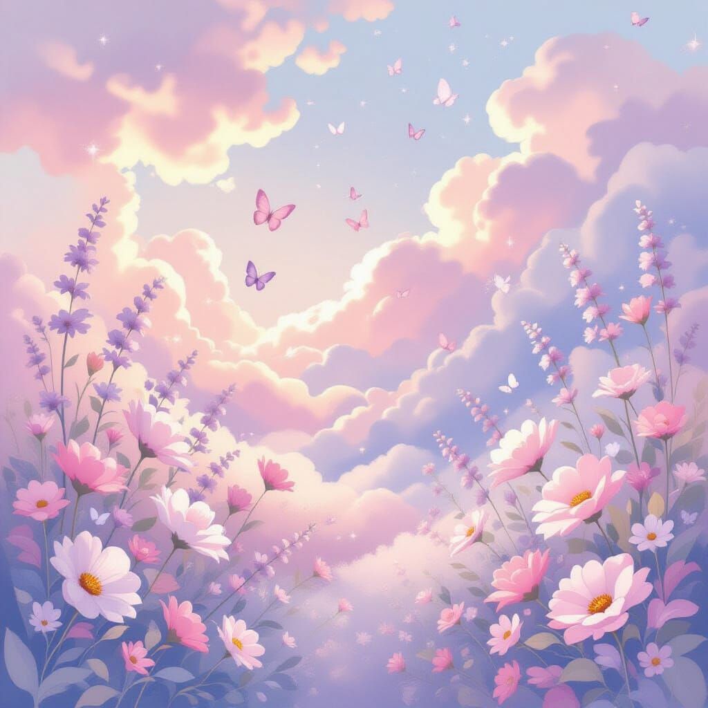 This image shows a dreamlike pastel world in gentle shades of pink, blue, lavender, and white. Tiny sparkling butterflies drift among flowers and clouds in this airy and soothing scene.