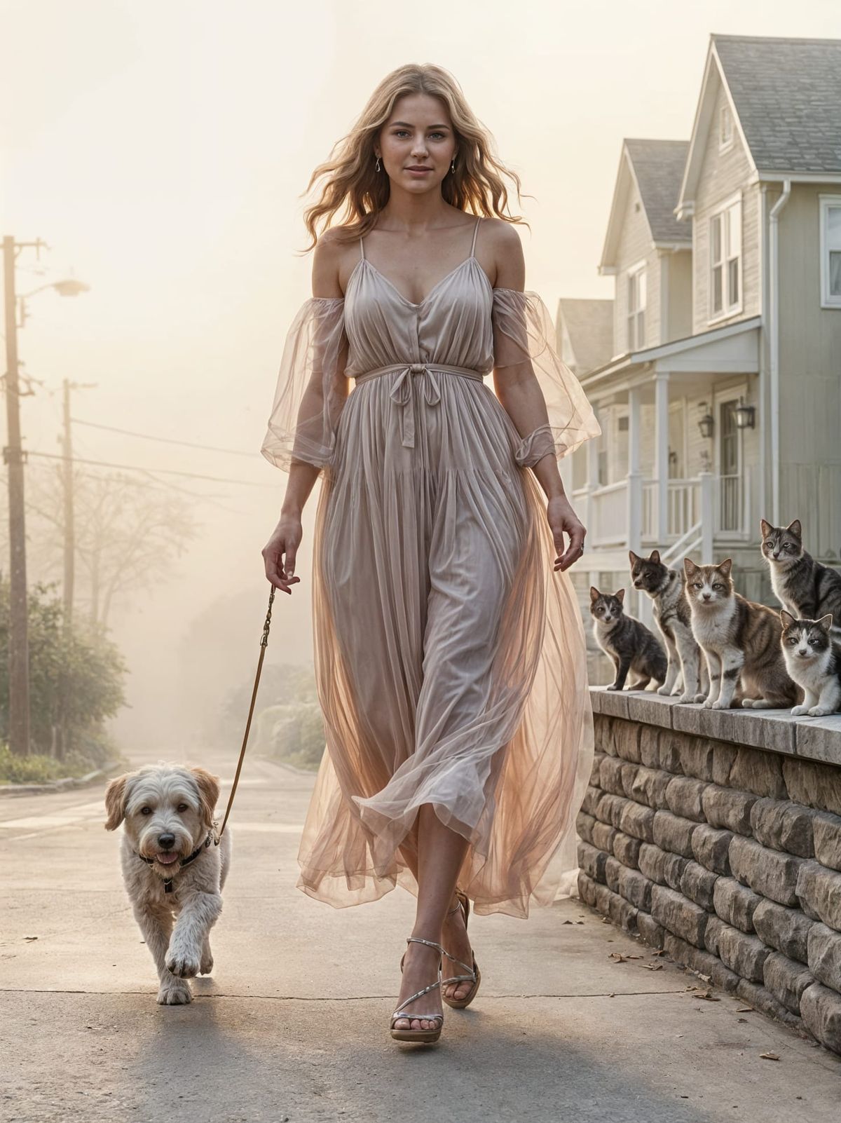 This watercolor painting depicts a tall American woman walking her Labradoodle in a misty suburban Virginia morning. The woman's big fluffy tulle maxi dress draws attention from the curious cats watching from a small stone wall.