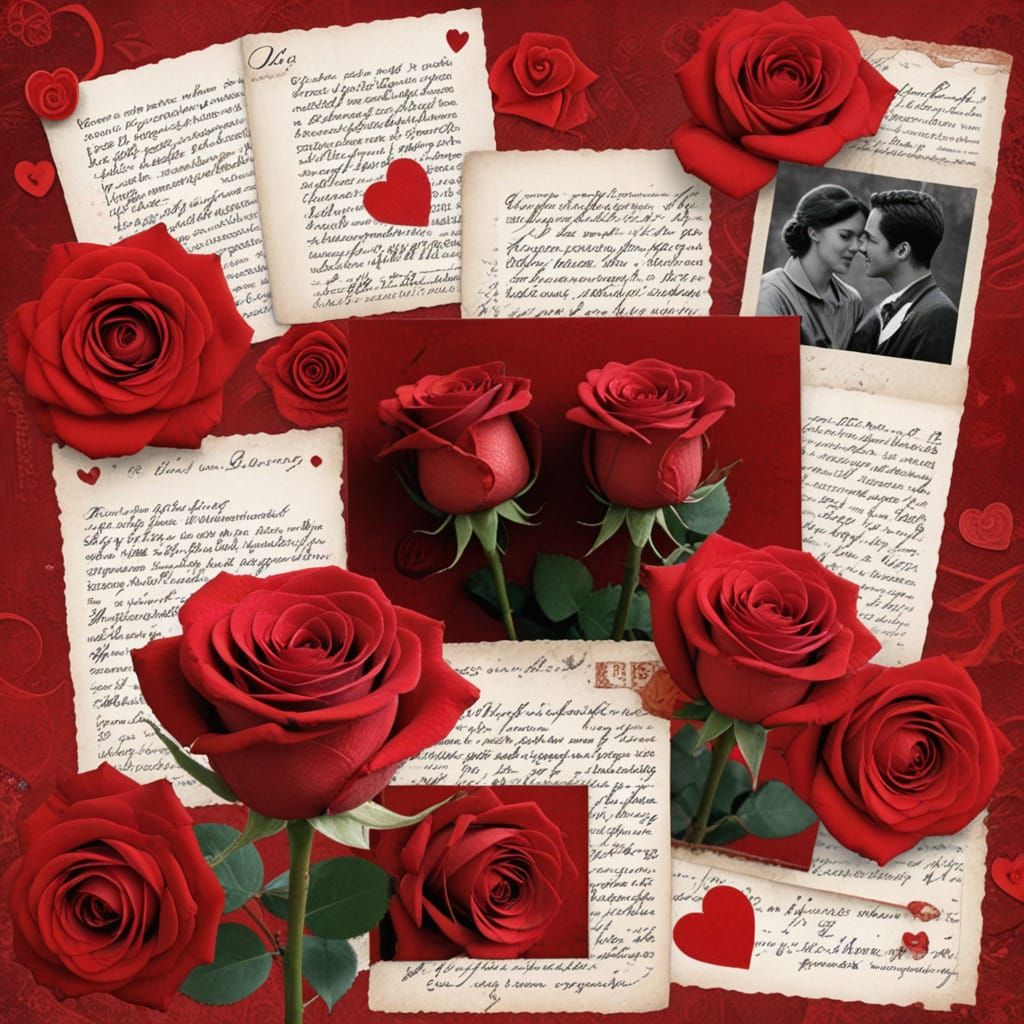 This image is a striking multimedia collage featuring red roses and vintage love letters in a beautiful monochromatic palette, creating a romantic and intimate atmosphere.