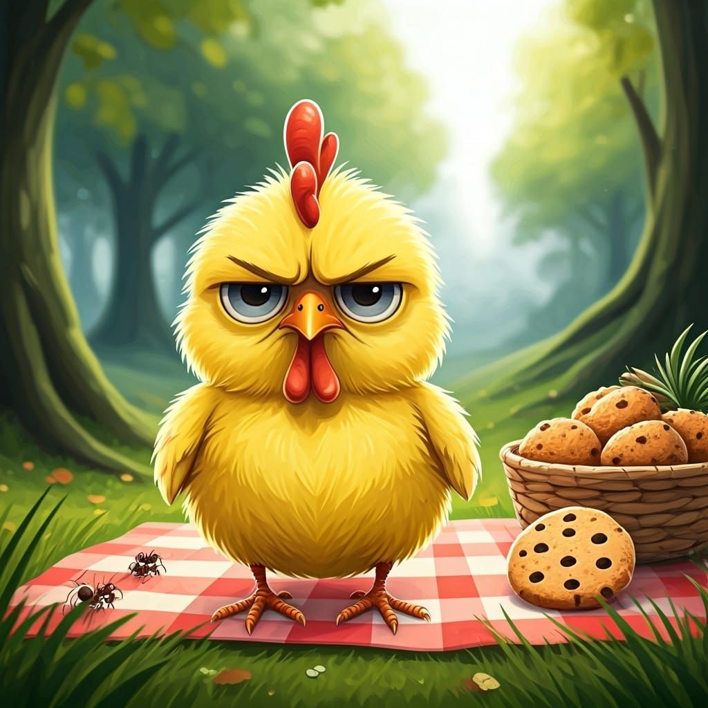 This image shows a disgruntled baby chick at a picnic, observing ants stealing a cookie. The artwork is rendered in a watercolor style, emphasizing soft textures and delicate washes of color.