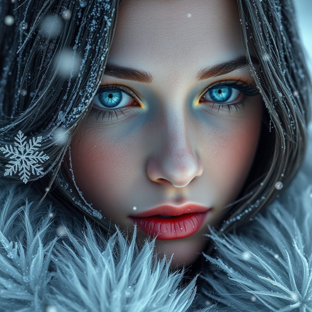 This image shows a woman's face illuminated by frosty light, her skin covered in ice crystals. Her turquoise eyes reflect the winter scene, and frost dusts her lashes. The artwork evokes a magical winter atmosphere.