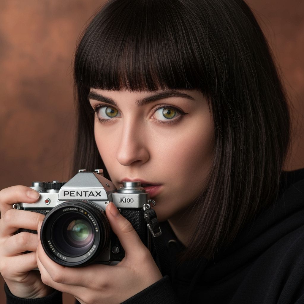This image shows a close-up portrait of a stunning French woman with cut bangs. The hyperrealistic rendering features bright olive eyes, volumetric lighting, and high contrast on textured copper metal paper.