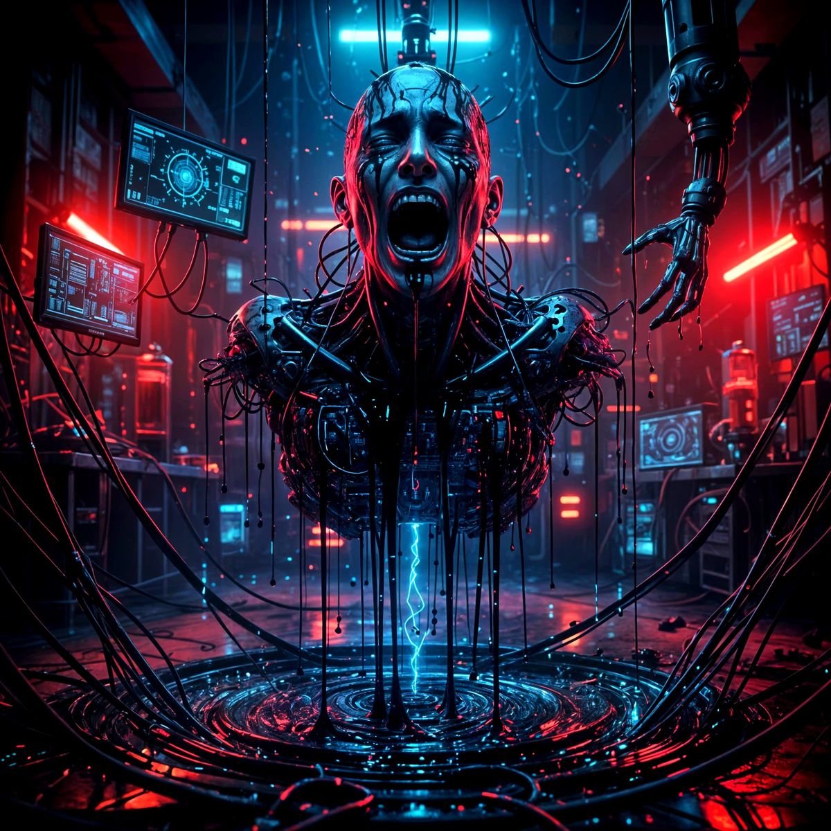 A photorealistic render of a screaming android in agony, with oil dripping and cables integrated into its skin, set against a detailed neon cybernetic laboratory.