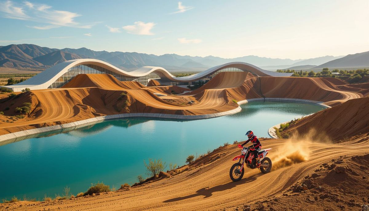 This image shows a dynamic dirt bike track featuring ramps and jumps over water, designed with architectural flair. Captured with a wide-angle lens and dramatic lighting for extreme sports photography.