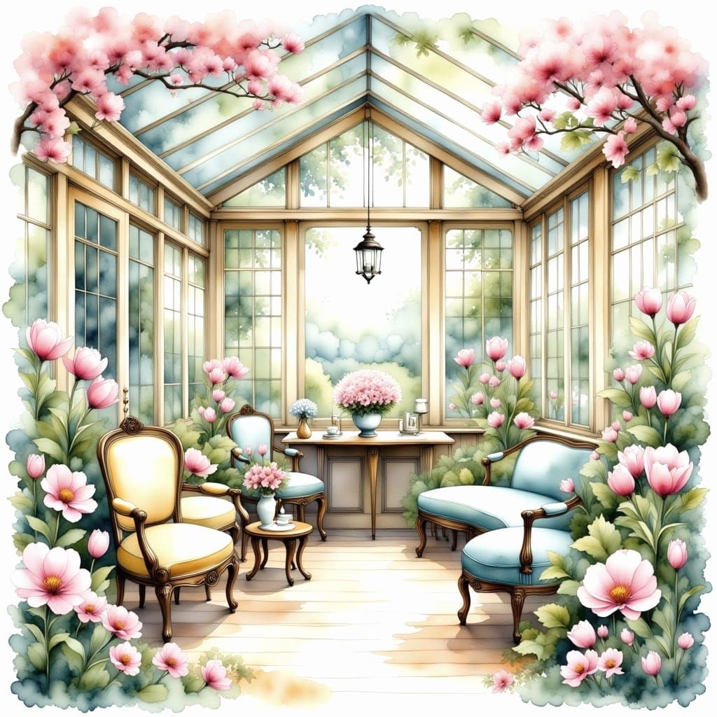 This serene watercolor painting depicts a beautifully decorated English conservatory with a lush spring garden outside, featuring tulips, climbing roses, and camellias in soft cream, apricot, and aqua tones.