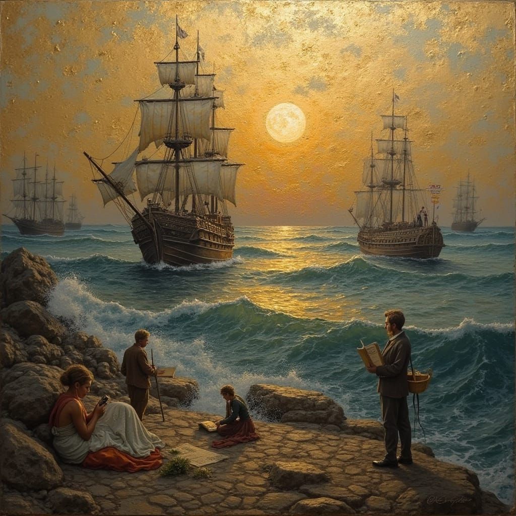 uma pintura estilo Klimt + jean-leon gerome e um artista escultor esculpindo um farol com as letras "BG" surreal segura um quadro com as mãos apresentando iluminação suave e em um dos lados da coluna um brasão antigo em ouro e prata no centro as letras góticas escrito “BG” criando uma atmosfera clássica ...