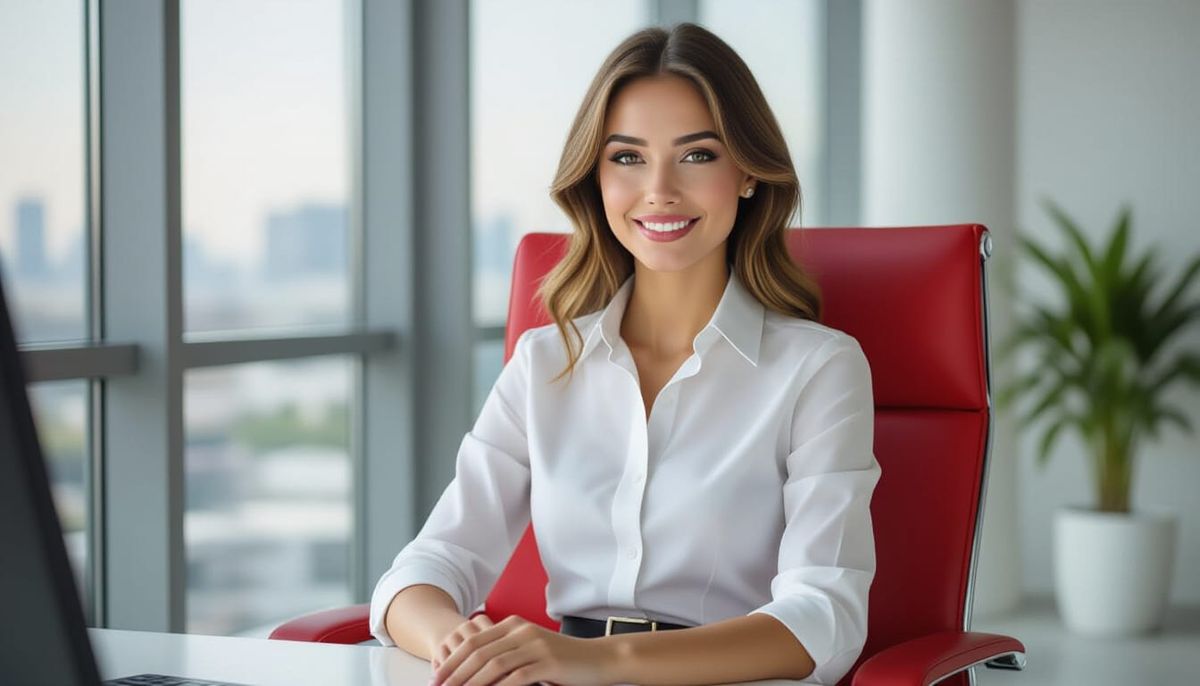 A photorealistic image of a young secretary with stylish hair and pretty eyes, seated in a modern red office chair. She is wearing professional attire in a well-lit, upscale office setting.