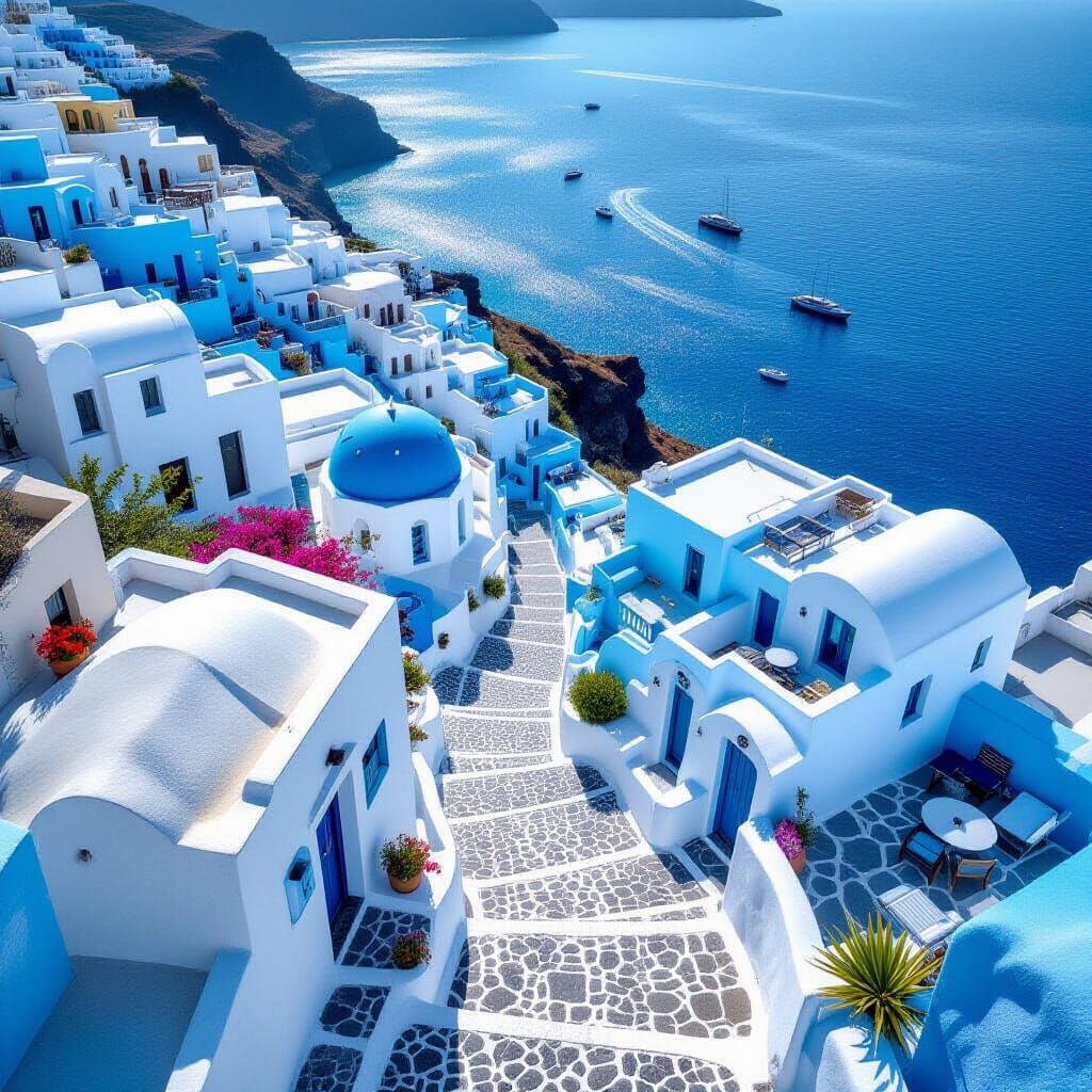 This image shows a top-down drone view of Sidi Bou Said's iconic blue and white architecture along a winding street. The vibrant Mediterranean colors create sharp contrasts on a sunny day.