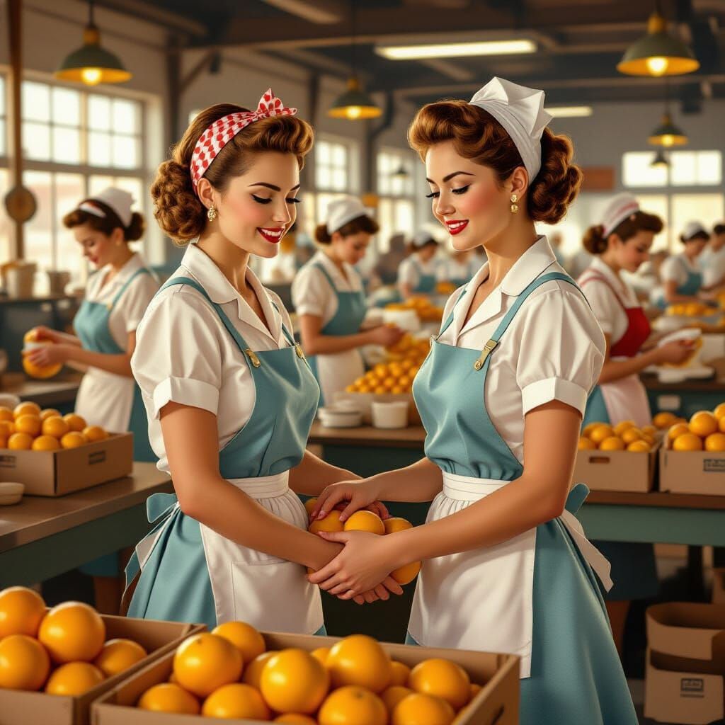 This image depicts women in vintage 1950s fashion, working in factories and markets. The artwork has a nostalgic, retro feel, reminiscent of mid-century paintings with warm, golden lighting.
