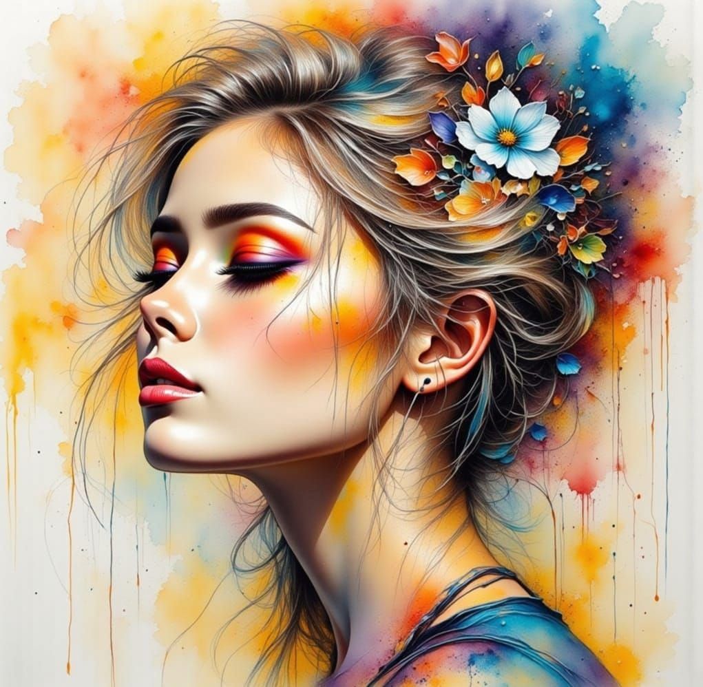 This image shows a striking beauty portrait with impasto oil paint textures set against a delicate watercolor backdrop. The artwork blends traditional techniques for a unique aesthetic.