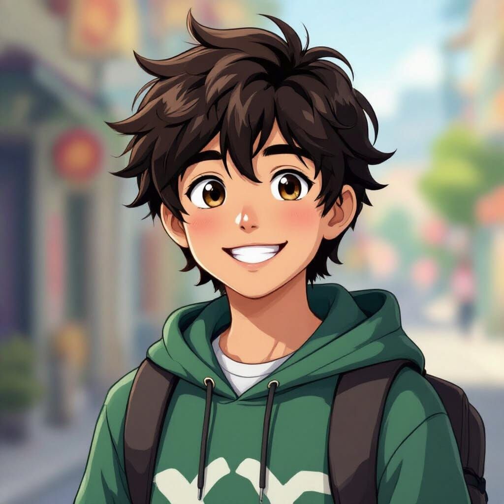 A vibrant image of a handsome, dark-haired teen in casual gamer attire, smiling with youthful exuberance. The artwork draws inspiration from Studio Ghibli's character design, rendered with soft textures.