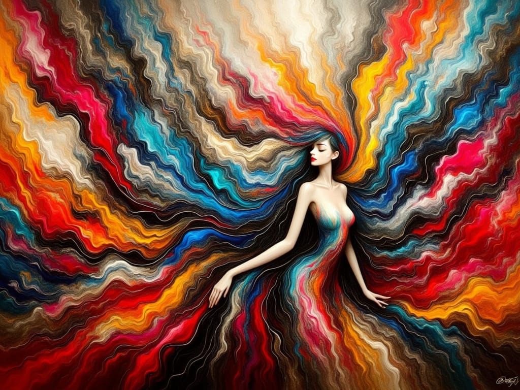 This dynamic abstract painting showcases a kaleidoscope of colors blending in a complex composition, with bold brushstrokes, layered textures, and intricate patterns emerging from the chaos, reminiscent of gestural abstractions and Art Deco's luxurious ornamentation.